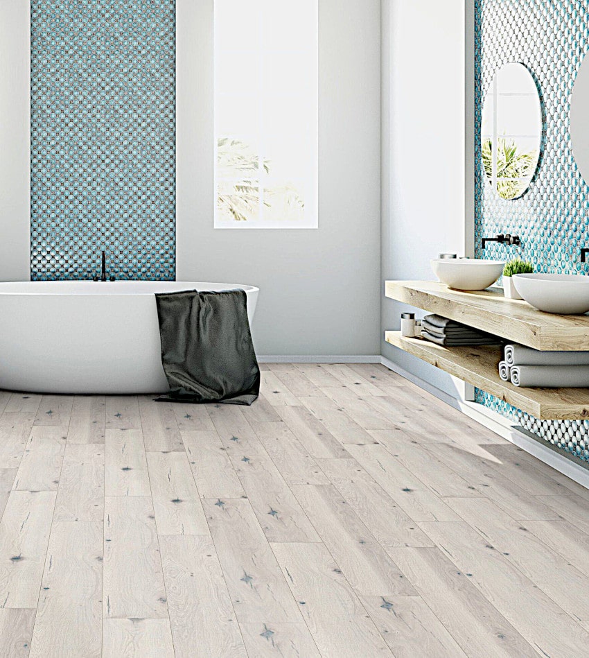 Deze vinyl vloer Apeldoorn is gelegd op een gerenoveerde betonvloer met vloerverwarming in een badkamer. De ondervloer is een 2mm perforatie folie met een hele lage weerstand en kan er een prima warmte doorheen. De vinyl vloer Apeldoorn is een 4mm dik vinyl met klik systeem. Het ontwerp van het PVC is het patroon van een echte eiken vloer is een zacht witte toon. Het ontwerp heeft knoesten zodat het er mooi levendig uitziet. Voordat het PVC is gelegd is de vloer met zelf nivellerende egaline behandeld.